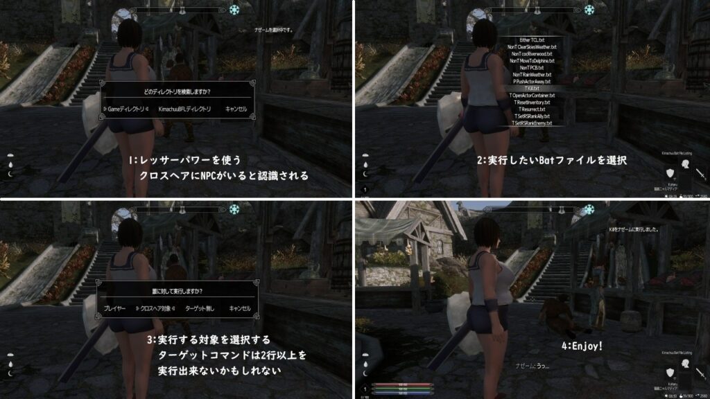 GameディレクトリとこのMOD専用のディレクトリに存在するbatファイルをリスト化して、ターゲットを選んで実行するコンソールコマンド補助装置です。