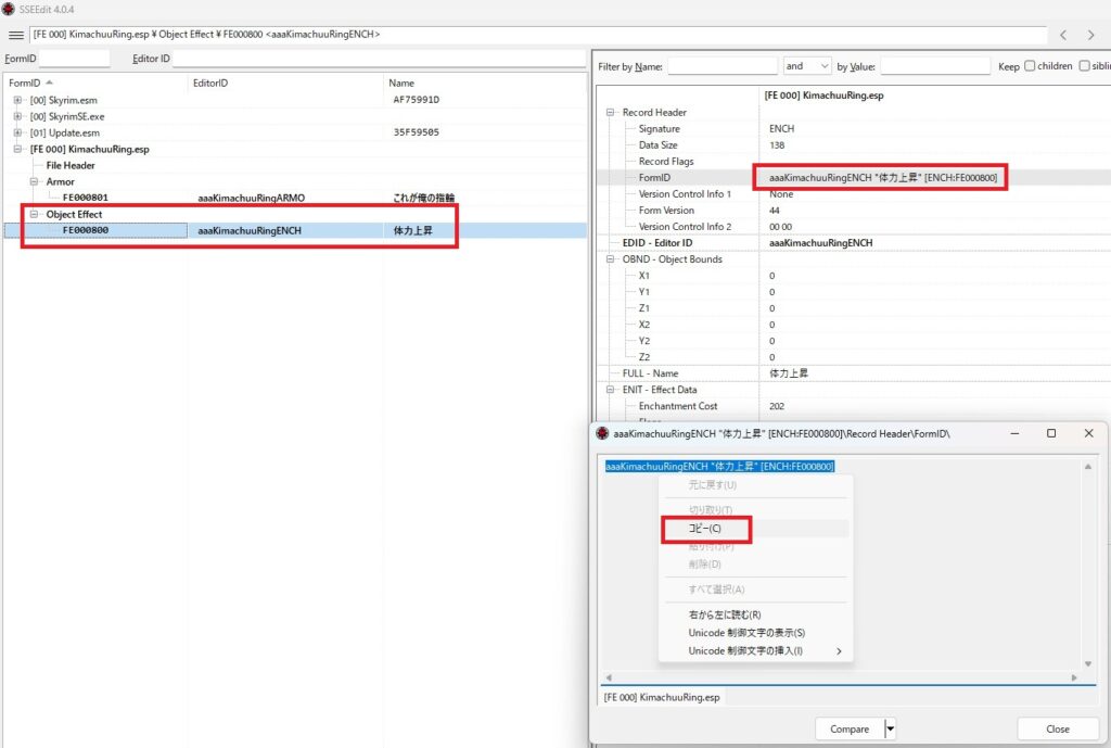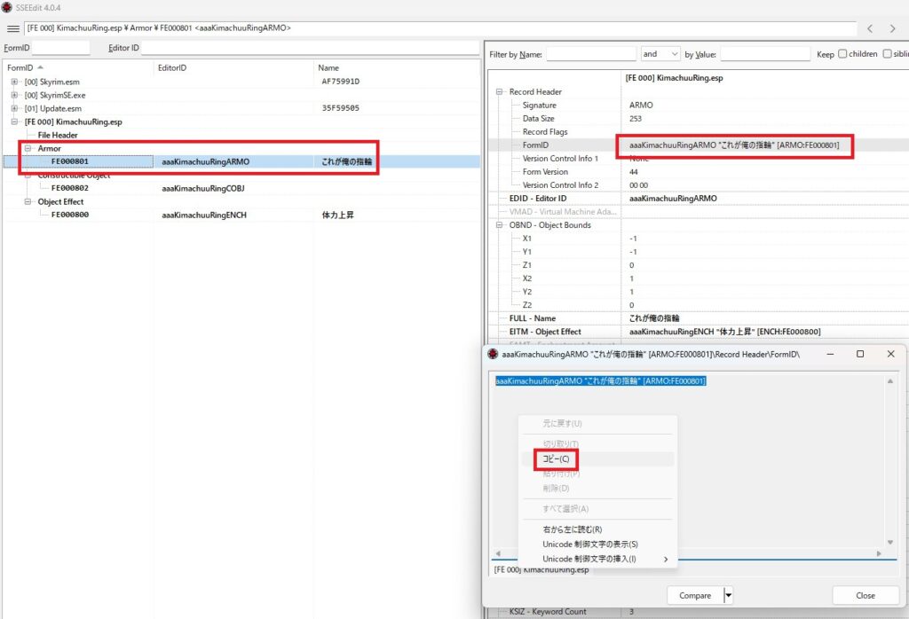 右側上部のFormIDの部分をダブルクリックして、テキストボックスが出たら選択で囲ってコピーしてください。